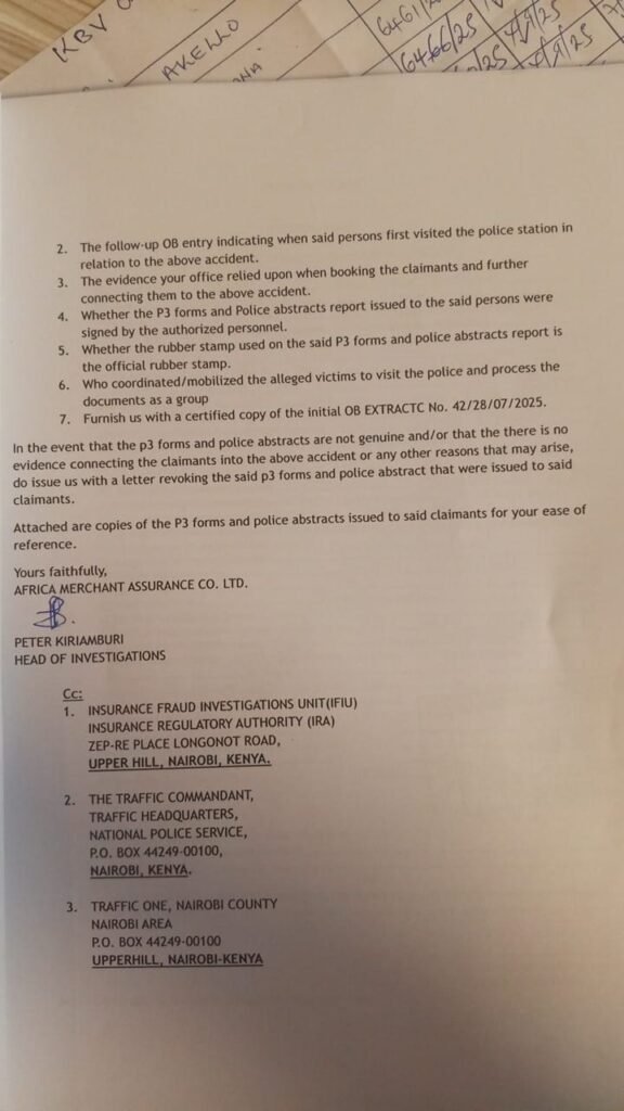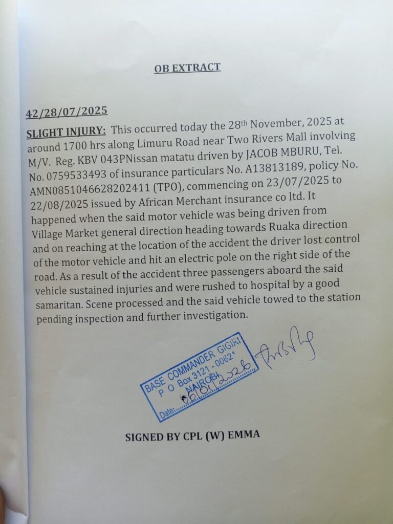 In a letter dated January 7, 2026, the Gigiri Traffic Base Commander reportedly stated that the police abstract and P3 form submitted for verification were forged, and did not originate from Gigiri Traffic Base. The commander further said the documents were not traceable to official records and that the station disassociated itself from them and any claims arising from them.