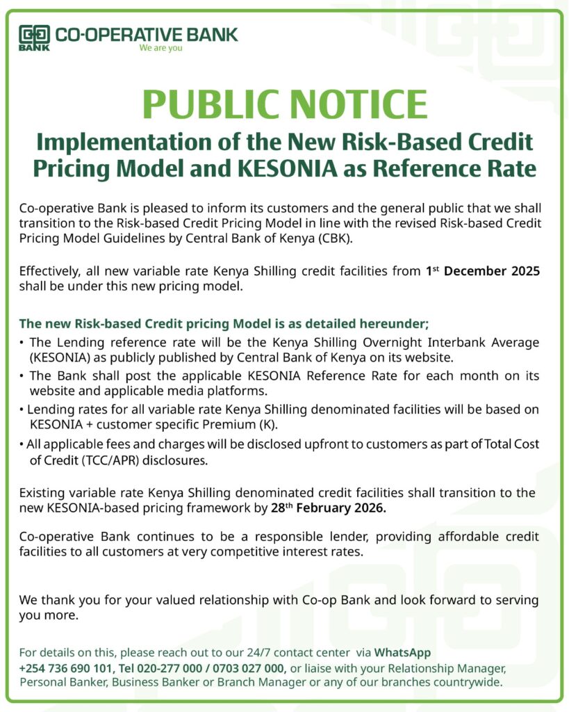 Co-operative Bank of Kenya has announced a major shift in how it prices its credit facilities, confirming it will fully transition to a Risk-Based Credit Pricing Model starting 1st December 2025, in line with revised guidelines issued by the Central Bank of Kenya (CBK).